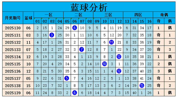 蓝球分析:上期蓝球开出偶数号码06,近10期奇偶比为5:5,奇数、偶数走势相同,近十期蓝球奇偶走势为:偶-奇-奇-奇-偶-偶-偶-奇-奇-偶-,本期蓝球关注奇数开出;本期蓝球参考:07