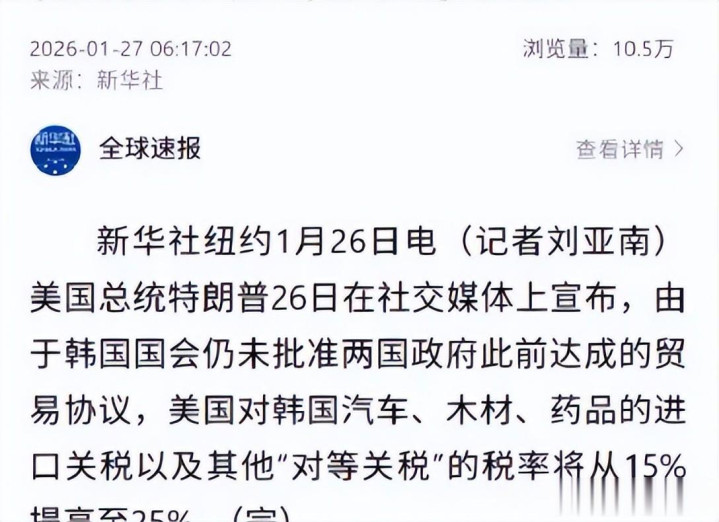 当地时间1月26日,特朗普于“真相社交”毫无预兆地发文突袭。他径直给韩国冠以“不履约”之名,还宣称要将韩国输美汽车、木材、制药等产品关税,从15%迅速提至25%!