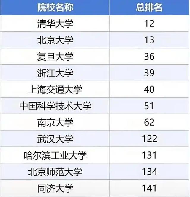 武汉大学排在第122位。哈工大排在第131位。北京师范大学排在第134位。同济大学排在第141位。这些学校虽然排名数字不一样,但是各有各的绝技。哈工大在航天、军工等重要领域一直是中国的国家队,很多重大工程都离不开它的支持。北师大是全国师范院校的龙头老大,教育学、心理学等都是强势专业。同济大学在土木工程、建筑、城市规划方面有丰富的积累,很多城市标志性建筑背后都有它们的影子。武大是测绘、水利等老牌专业闻名在外,加上校园环境好,具有很强的吸引力。